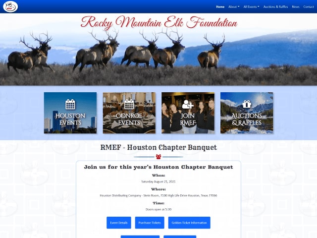 The Houston Chapter of Rocky Mountain Elk Foundation, a wildlife conservation organization in North America. RMEF has helped protect and enhance over 7 million acres of wildlife habitat and reintroduce elk to many areas of the country. RMEFHouston.com was built by Mark Smith using one of his custom themes. Mark also maintains and updates the site as needed for RMEFHouston.